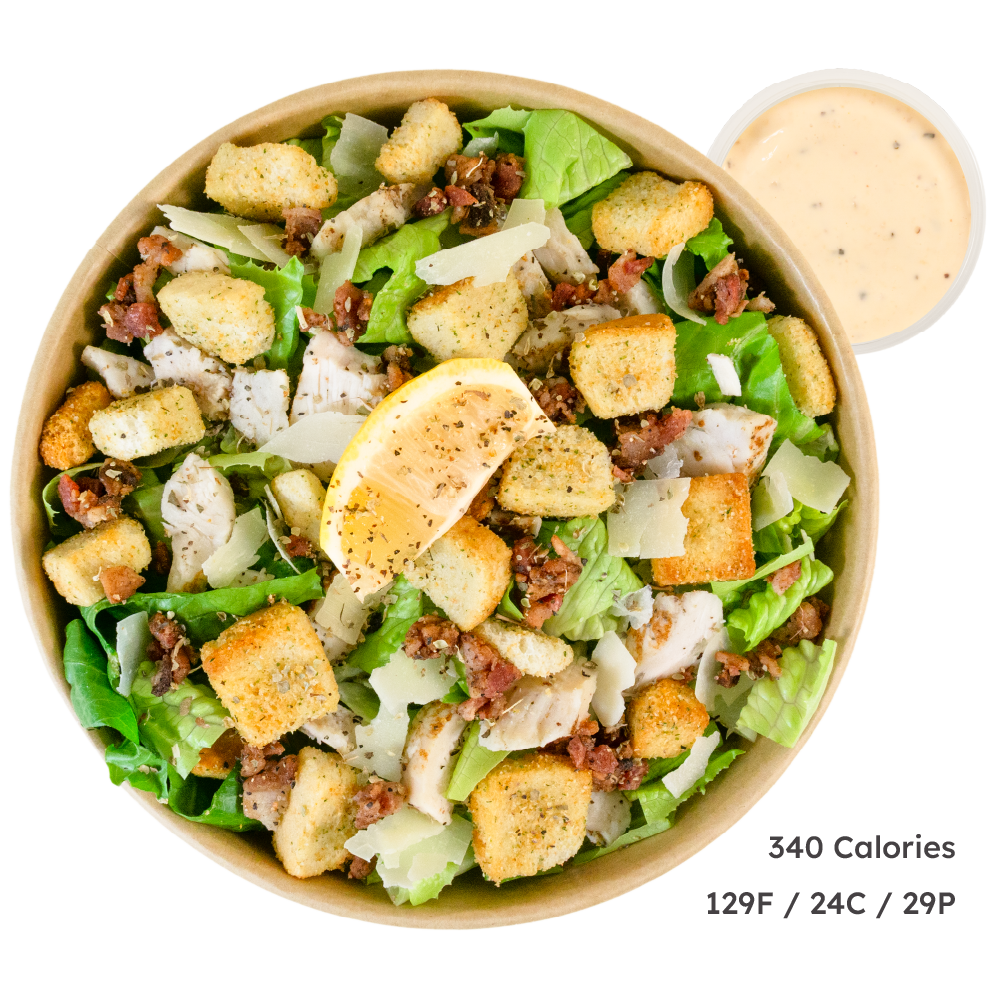 Romaine, Seasoned Chicken, French Croutons, Parmesan Cheese, Bacon, Spice Blend, Lemon Wedge, Robust Caesar Dressing (135 cal)