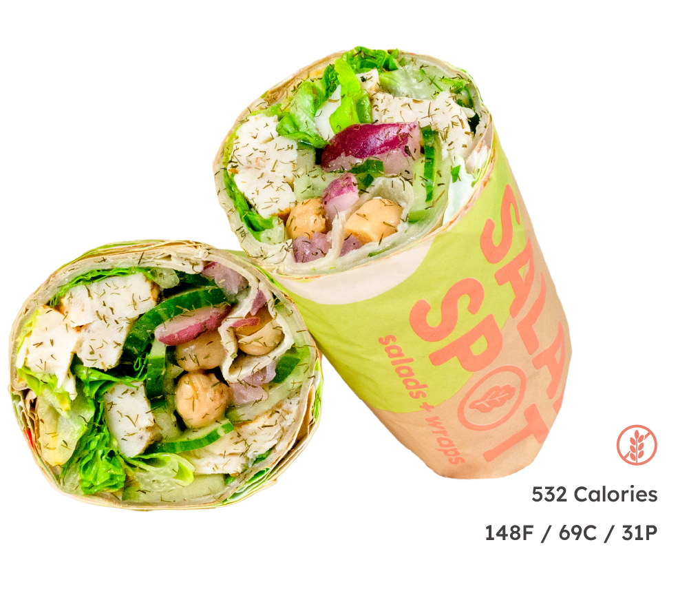 Mixed Grains, Butter Leaf Blend, Seasoned Chicken, French Croutons, Cherry Tomatoes, English Cucumbers, Garbanzo Beans, Red Onions, Feta Cheese, Tzatziki Sauce, Greek Vinaigrette (390 cal)